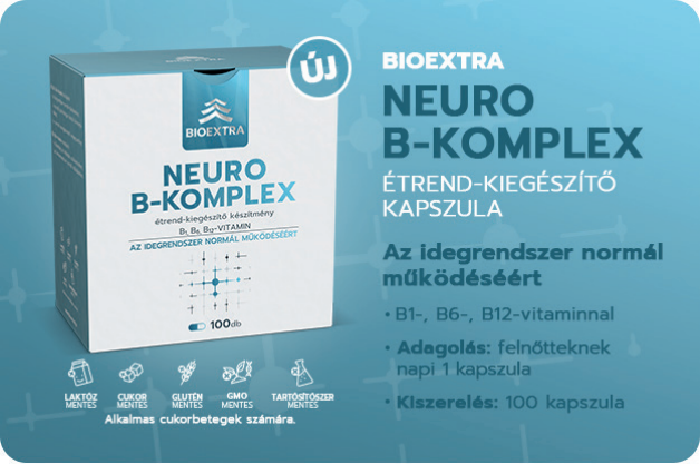 Legújabb készítményünk a Bioextra Neuro B-komplex étrend-kiegészítő kapszula, amely három hatóanyag (100 mg tiamin (B1-vitamin), 12 mg piridoxin (B6-vitamin), 1000 μg cianokobalamin (B12-vitamin)) kombinációja.