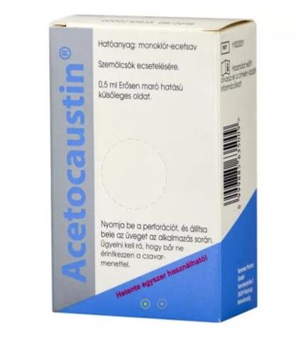 Az Acetocaustin egy monoklór-ecetsav tartalmú, erős hatású orvostechnikai eszköz, amelyet kézen és lábon található közönséges szemölcsök otthoni kezelésére használnak. Heti egyszeri alkalmazással a szemölcsök általában 5 hét alatt eltávolíthatók, mivel a sav leoldja a vírusos szövetet. Kizárólag a szemölcsre szabad kenni, a környező bőrt védeni kell.Fontos alkalmazási tudnivalók:Használat: A szemölcs körüli egészséges bőrt érdemes zsíros kenőccsel (pl. vazelin, cinkpaszta) bekenni a védelem érdekében. A spatulával csak a szemölcsre vigye fel az oldatot.Gyakoriság: Elég hetente egyszer alkalmazni.Időtartam: A kezelés maximum 5 hétig tarthat.