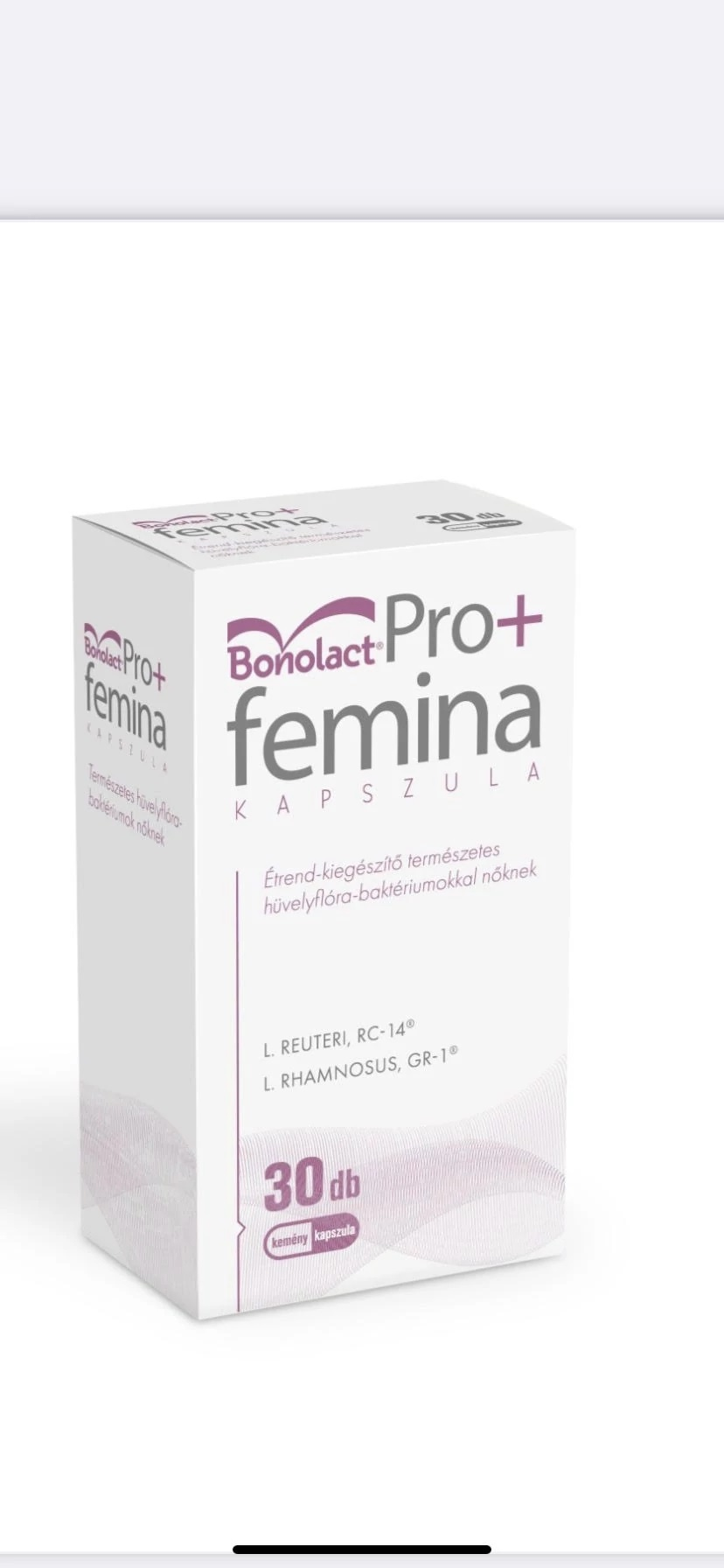 A Bonolact® Pro+femina probiotikum kapszula hatását klinikai vizsgálatok igazolják, ugyanis speciális tulajdonságai alapján kiválasztott Lactobacillus rhamnosus, GR-1® és Lactobacillus reuteri, RC-14® probiotikus baktériumokat tartalmaz, kapszulázott formában. Ezek a baktériumok általában jelen vannak a nők egészséges hüvelyflórájában és különösen alkalmasak a hüvelyben való megtelepedésre.Szájon át szedhető élőflórás készítmény nőknek, természetes hüvelyflóra-baktériumokkal. Lactobacillus rhamnosus, GR-1®, és Lactobacillus reuteri, RC-14® aktív baktériumokat legalább 4 milliárd CFU mennyiségben tartalmaz kapszulánként.A készítményt várandós és szoptatós anyák is szedhetik! Alkalmazása során mellékhatás megjelenése nem ismeretes.A hüvely rendkívül érzékeny szerv. Mikroflórájának egyensúlyát hétköznapi dolgok is felboríthatják és kellemetlen tüneteket okozhatnak. Egészséges felnőtt nők természetes hüvelyflórájában a Lactobacillusok dominálnak. A Bonolact Pro+femina kapszula baktériumai a hüvely természetes mikroflórájának részei.Miért a Bonolact® Pro+femina?? Mert szájon át szedhető, így kényelmes alkalmazású.? 4 éves kortól szedhető, így kislányoknál is sokkal kényelmesebben alkalmazható alternatívát jelenthet.? Mert a benne található UREX® kombináció (Lactobacillus rhamnosus GR-1® és Lactobacillus reuteri, RC-14®) a világ legjobban dokumentált probiotikus baktériumkeveréke a nők urogenitális (húgyúti és intim) egészségének támogatására.? Mert idén 10 éve, hogy kapható a patikákban, ami számunkra azt bizonyítja, hogy szeretitek a terméket!? Mert biztonságosan alkalmazható mindenkinek, akár várandós vagy szoptató édesanyáknak is!Adagolás:Naponta 1 kapszula szájon át szedve étkezés közben. Antibiotikum kezelés alatt a Bonolact Pro+femina kapszula alkalmazása legalább 3 órával a gyógyszer bevétele után javasolt.