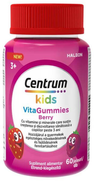 Eper/málna ízű étrend-kiegészítő rágható gumivitamin vitaminokkal és ásványi anyagokkal 3 éven felüli gyermekeknek.Hozzájárul a gyermekek egészséges növekedésének és fejlődésének fenntartásához A Centrum Kids Gummies egy ízletes eper/málna ízű étrend-kiegészítő, amely vitaminokat és ásványi anyagokat tartalmaz, kifejezetten 3 éven felüli gyermekek számára. Támogatja a gyermekek egészséges növekedését és fejlődését, biztosítva a szükséges tápanyagokat a mindennapi élethez. Gyerek multivitamin.Főbb Előnyök Egészséges Csontozat A cink és a D-vitamin hozzájárulnak az egészséges csontozat fenntartásához, támogatva a gyermekek növekedését.Eper/málna ízű étrend-kiegészítő rágható gumivitamin vitaminokkal és ásványi anyagokkal 3 éven felüli gyermekeknek.Immunrendszer Támogatása A cink, valamint az A-, C- és D-vitaminok segítik az immunrendszer normál működését, támogatva a gyermekek védekezőképességét.Energia és Idegrendszer A B6-, B12-vitamin és a biotin támogatják a gyermekek energia szükségletét, míg a C-vitamin, B12-vitamin és biotin hozzájárulnak az idegrendszer normál működéséhez.Érzelmi Funkciók A biotin és a niacin hozzájárul a normál érzelmi funkció fenntartásához.Sejtvédelem Az E-vitamin hozzájárul a sejtek oxidatív stresszel szembeni védelméhez, segítve a sejtek egészségének megőrzését.Hozzájárul az egészséges csontozat fenntartásához (cink, D-vitamin), hozzájárul az immunrendszer normál működéséhez (cink, A-, C- és D-vitamin) valamint támogatja a gyermekek energia szükségletét.Hozzájárul az idegrendszer normál működéséhez (C-vitamin, B-vitamin, biotin) és a normál érzelmi funkció fenntartásához (biotin, niacin)Az E-vitamin hozzájárul a sejtek oxidatív stresszel szembeni védelméhez.Ajánlott fogyasztási mennyiség: 3 éven felüli gyermekeknek napi 1 gumivitamin.
