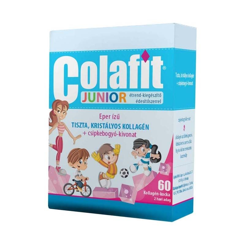 A Colafit Junior kockák I. típusú kristályos kollagént tartalmaznak, csipkebogyó-kivonattal. 1 darab Colafit Junior kocka 40 mg liofilizált kollagént tartalmaz, amely 400 mg kollagén gélnek felel meg.A hirtelen növekedés és a folyamatos, intenzív sportolás miatt gyakran alakulhat ki gyermekeknél térd- és bokafájdalom.A kollagén, amelyet a porcok "kenőanyagának" is neveznek, hatékony kiegészítése lehet a gyermekek és kamaszok ízületi- és porcproblémáinak, ugyanis biztosítja az ízületek és a "szivacsszerű” porcok rugalmasságát.A rugalmasság növelésével a kollagén stabilabbá teszi a porcokat, így csökkenthetőek az ízületi fájdalmak és a sportsérülések esélye is kisebb.Emellett, a kollagén fontos eleme a csontszerkezetnek is.Adagolási javaslat:Gyermekeknek: 3 éves kortól napi 1 kocka 1-2 hónapon keresztül.A kockát reggel éhgyomorra kell bevenni, legalább 10 perccel étkezés előtt.Felnőtteknek napi 2 kocka ajánlott.A megfelelő hatékonyság érdekében a kockát le kell nyelni.