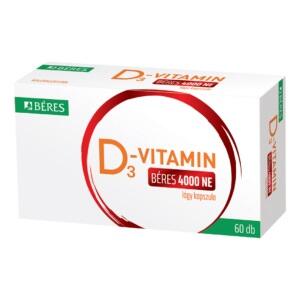 D3 -vitamin Béres 4000 NE lágy kapszula vény nélkül kapható kolekalciferol hatóanyagot tartalmazó gyógyszer.A D3 -vitamin Béres 4000 NE lágy kapszula hatóanyaga a kolekalciferol (D3 -vitamin).100 mikrogramm kolekalciferolt tartalmaz lágy kapszulánként, amely megfelel 4000 NE D3 -vitaminnak.A kolekalciferol növeli a kalcium felszívódását a bélrendszerből, fokozza a kalcium visszaszívódását a vesében, fokozza a csontképződést, valamint csökkenti a parathormon szintjét. A D-vitamin jelenlétét érzékelő képletek (receptorok) a vázrendszeren kívül számos egyéb szövetben is megtalálhatók, éppen ezért a D3 -vitamin szerteágazó hatással rendelkezik számos élettani folyamatban.A D3 -vitamin Béres 4000 NE lágy kapszula alkalmazása felnőtteknek és 14 éves és idősebb serdülőknek javallott a következő esetekben:D vitamin-hiányos állapotok megelőzésére és kezelésére;D-vitamin pótlására a csontritkulás célzott kezelésének kiegészítéseként olyan betegeknek, akiknél a D-vitamin-hiány kockázata fennáll.