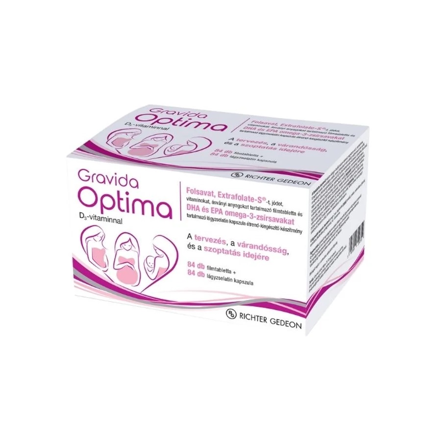 Gravida Optima Folsavat, Extrafolate-S-t, jódot, vitaminokat, ásvanyi anyagokat tartalmazófilmtabletta és DHA és EPA omega-3-zsírsavakat tartalmazó lágyzselatin kapszula étrend-kiegészítőkészítmény.A Gravida Optima fogyasztása a fogantatás tervezésekor, valamint a varandósság és a szoptatás időszakában megnövekedett vitamin es ásvanyi anyag szükséglet kiegészítésére ajánlott.A folát (folsav és Extrafolate-S) részt vesz a sejtosztódásban, terhesség alatt az anyai szövetek növekedésében, szerepet játszik a normál aminosav-szintézisbenés a vérképződésben. A kiegészítő folsavbevitel növeli az anyai folátellátottság szintjét. Az alacsony anyai folátszint a fejlődő magzat velőcső-záródási rendellenessége kialakulásának a kockázati tényezője. A jótékony hatás napi 400 mikrogramm, a fogantatást megelőzően legalább egy hónapig, és a fogamzást követően három hónapig folytatott kiegészítő folsavbevitellelérhető el. A velőcső-záródási rendellenességnek több kockázati tényezője van.A kockázati tényezők egyikének - alacsony folsavbevitel - megváltoztatása nem feltétlenül eredményezi a betegség kockázatának csökkentését, ha más okok vezetnek annak kialakulásához. Az anya szervezetéből vagy az anyatejből felvett dokozahexaénsay (DHA) hozzájárul a magzatés az anyatejjel táplált csecsemő megfelelő agyi fejlődéséhez és szemének megfelelőfejlődéséhez. A kedvező hatás eléréséhez az omega-3-zsírsavakból felnőttek számára aljánlott napi adagon (azaz 250 mg DHA és eikozapentaénsav - EPA) felül további 200 mg DHA-t kell naponta fogyasztani.Adagolás Naponta egy filmtablettát és egy kapszulát étkezés közben, minimum egy deciliter folyadékkal javasolt bevenni.