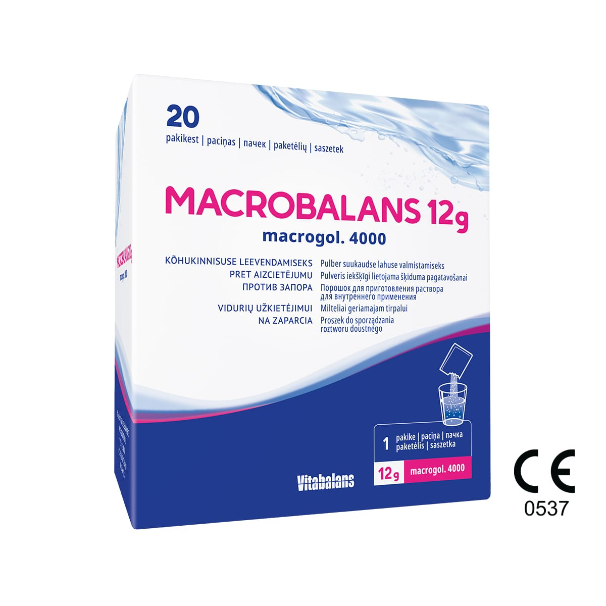 Jellemzők - Íztelen és szagtalan por székrekedés esetére, 8 éves kortól.- Hatóanyaga macrogol 4000, más összetevőt nem tartalmaz.- A macrogol megköti a vizet és növeli a béltartalomban lévő víz mennyiségét.- A macrogol nem befolyásolja a szervezetben lévő folyadékokat, a széklettel együtt ürül ki.- Laktóz-, glutén- és cukormentes, vegán termék.A Macrobalans CE-jelöléssel ellátott orvostechnikai eszköz.Használat előtt olvassa el a használati útmutatót.Adagolás Felnőttek és 8 év feletti gyermekek szokásos adag napi 1-2 alkalommal 1 tasak (12 g) folyadékba keverve.