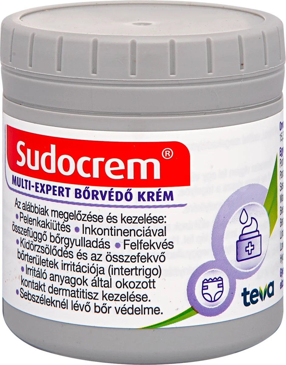 Eltérő* összetételének köszönhetően még szélesebb körben alkalmazható, így még több helyzetben számíthat rá.Legyen szó kisbabákról, gyerekekről, felnőttekről vagy idősekről – a Sudocrem Multi-Expert sokoldalú segítséget nyújt a bőrproblémák kezelésében.Nyugtatja és védi az érzékeny bőrt.Bőrvédő réteget képez a bőrön, így védelmet nyújt a nedvesség és az irritáló anyagokkal szemben.A gyulladáscsökkentő hatású cink-oxid tartalmával segíti a bőr védelmét, csökkenti a bőrpírt.Az emolliens hatású lanolin támogatja a bőr természetes védőrétegét, ami csökkenti az irritációt.A paraffin (szilárd és folyékony) pedig vízlepergető réteget képez a bőrön.Orvostechnikai eszköz.Gyógyászati segédeszköz.*A Sudocrem Védőkrémhez képest Egyetlen tégelyben sokoldalú segítség az egész családnak!Kontakt dermatitisz kezelése.Sebszéleknél lévő bőr védelme.Pelenkakiütés megelőzése és kezelése.Inkontinenciával összefüggő bőrgyulladás megelőzése és kezelése.Kidörzsölődés/Intertrigo megelőzése és kezelése.Felfekvés megelőzése és kezelése.