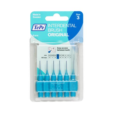 TePe Original fogköztisztító kefék 0,6 mm, kék, 6 db - a műanyag szigetelésű huzal maximálisan kíméli az ínyt és az érzékeny fognyakakat - rendkívül törésellenálló- lapos nyél a kényelmes és alapos tisztítás érdekében - a blisztercsomagolás tartalma: 6db fogköztisztító kefe + védőkupak.