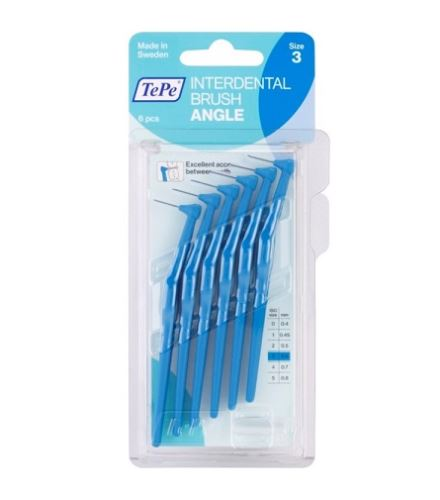 TePe Angle fogköztisztító kefék 0,6 mm, kék, 6 db - keskeny, derékszögben hajlított fejrész - megkönnyíti a fogközök tökéletes tisztítását - ideális a hátulsó fogközök tisztításához - az ergonomikus kialakítású hosszú, lapos nyél segíti a kefe tartását és a pontos mozgásokat - a műanyag szigetelésű huzal kíméli az érzékeny fognyakakat és az ínyt - a blisztercsomagolás tartalma: 6db fogköztisztító kefe + védőkupak.